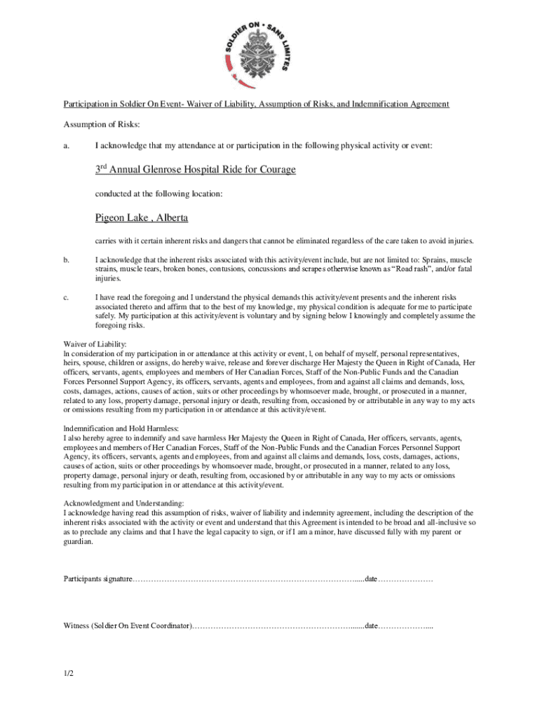 Participation in Soldier On Event Waiver of Liability, Assumption of Risks, and indemnification Agreement