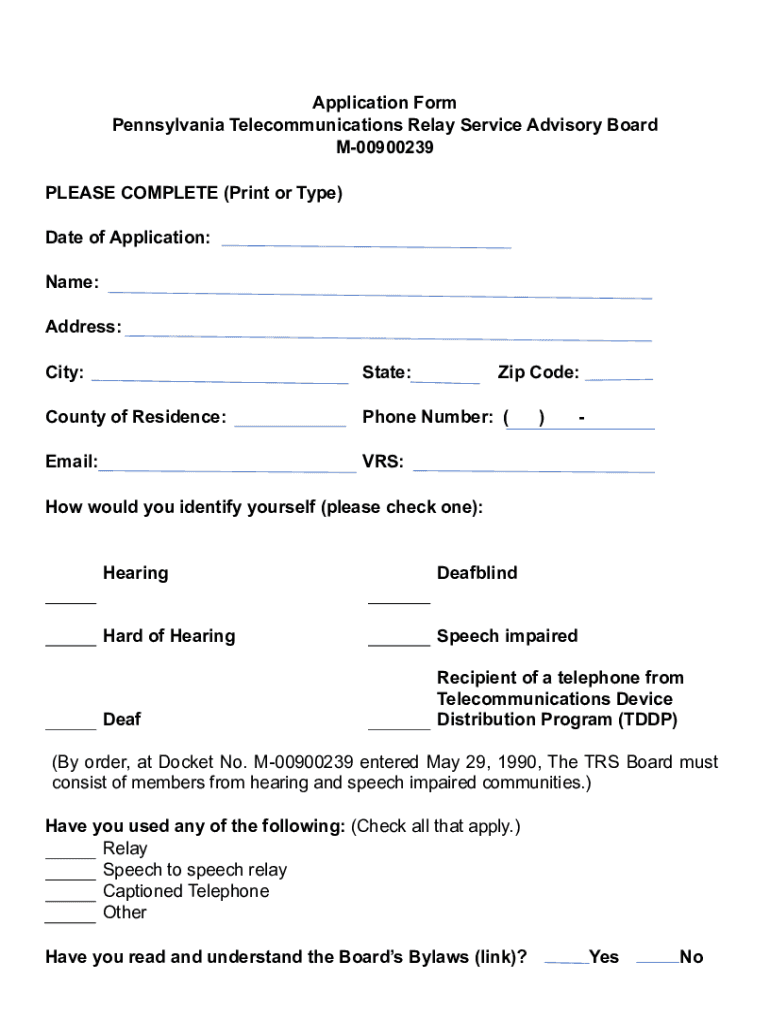 Application Form Pennsylvania Telecommunications Relay Service Advisory Board M00900239 PLEASE COMPLETE (Print or Type) Date of Application: Name: Address: City:State:Zip Code:County of Residence:Phone