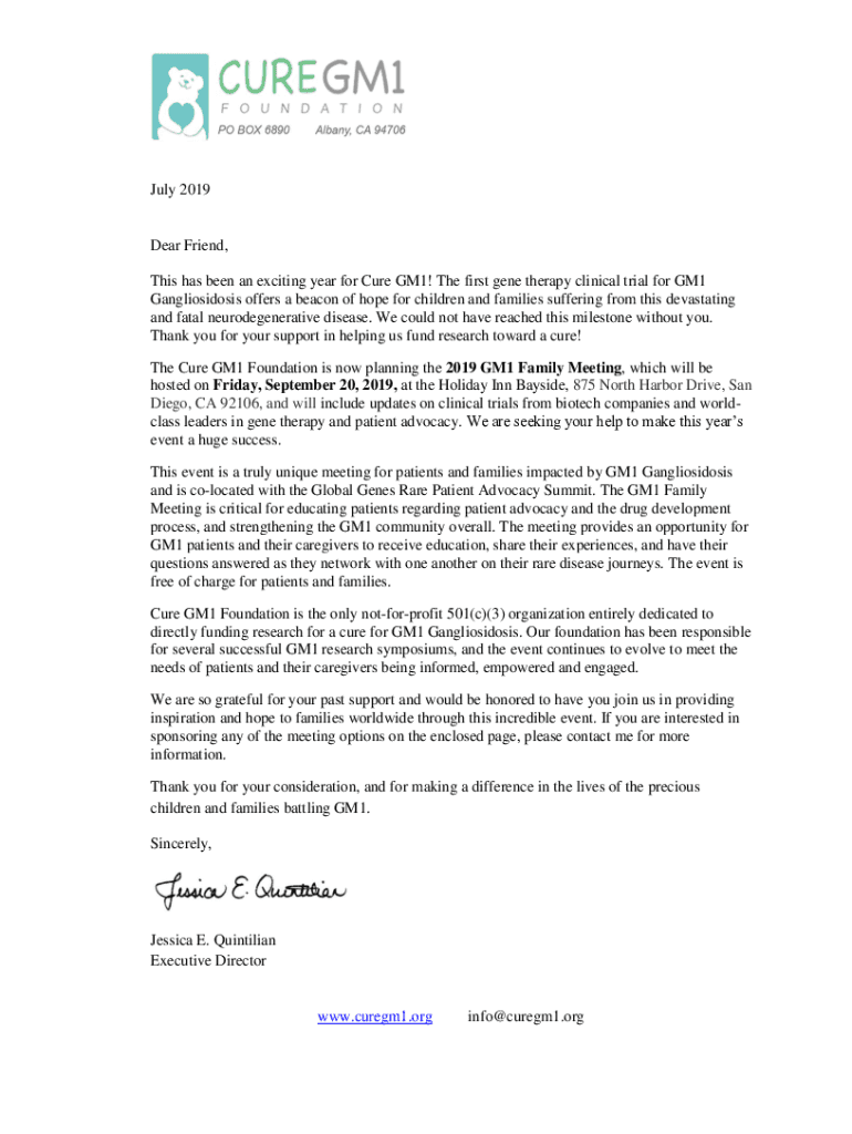 July 2019Dear Friend, This has been an exciting year for Cure GM1! The first gene therapy clinical trial for GM1 Gangliosidosis offers a beacon of hope for children and families suffering from this