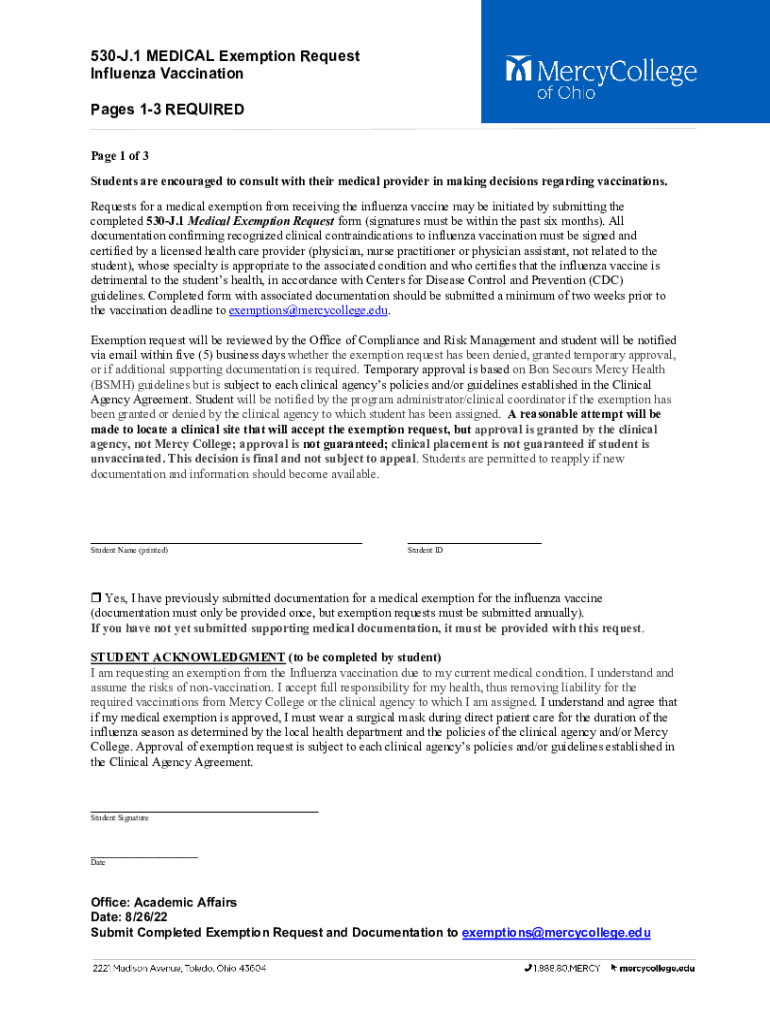 530J.1 MEDICAL Exemption Request Influenza Vaccination Pages 13 REQUIRED Page 1 of 3 Students are encouraged to consult with their medical provider in making decisions regarding vaccinations. Requests