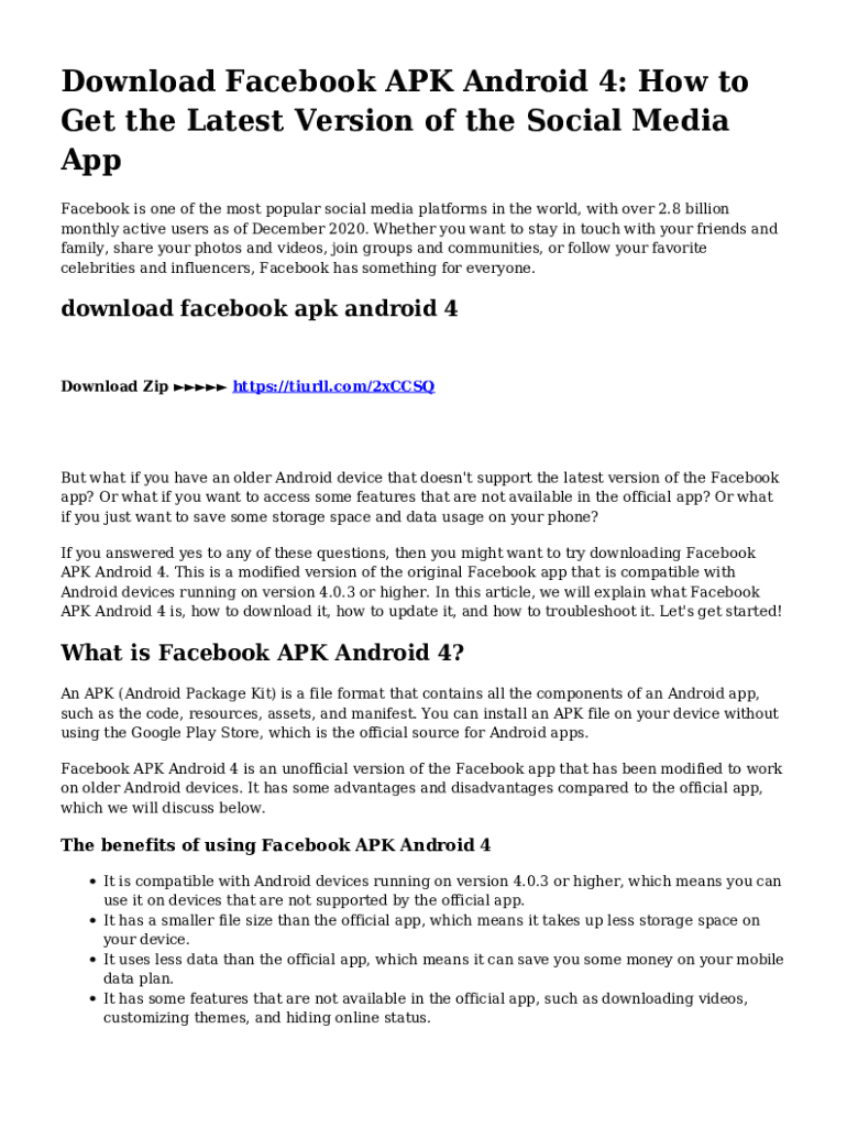 Download Facebook APK Android 4: How to Get the Latest Version of the Social Media App Facebook is one of the most popular social media platforms in the world, with over 2.8 billion monthly active
