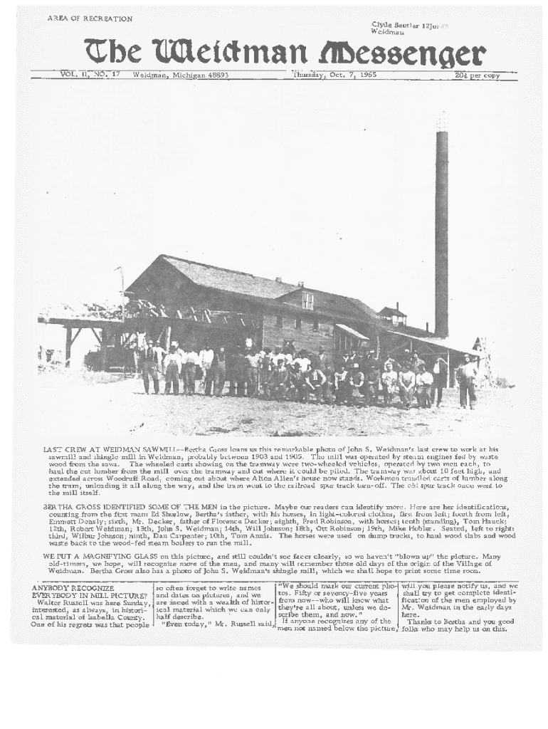 AREA Of RECREATIONClyde Beutler I 2Jui Weidmanbc UttetcHuan ttlSceecner VOL. II, NO. 17Weidman, Michigan 48893Thursday, Oct. 7, 195204: per coTJ V3..a,fkLAST CREW AT WEIDMAN SAWMILLBertha Gross loans