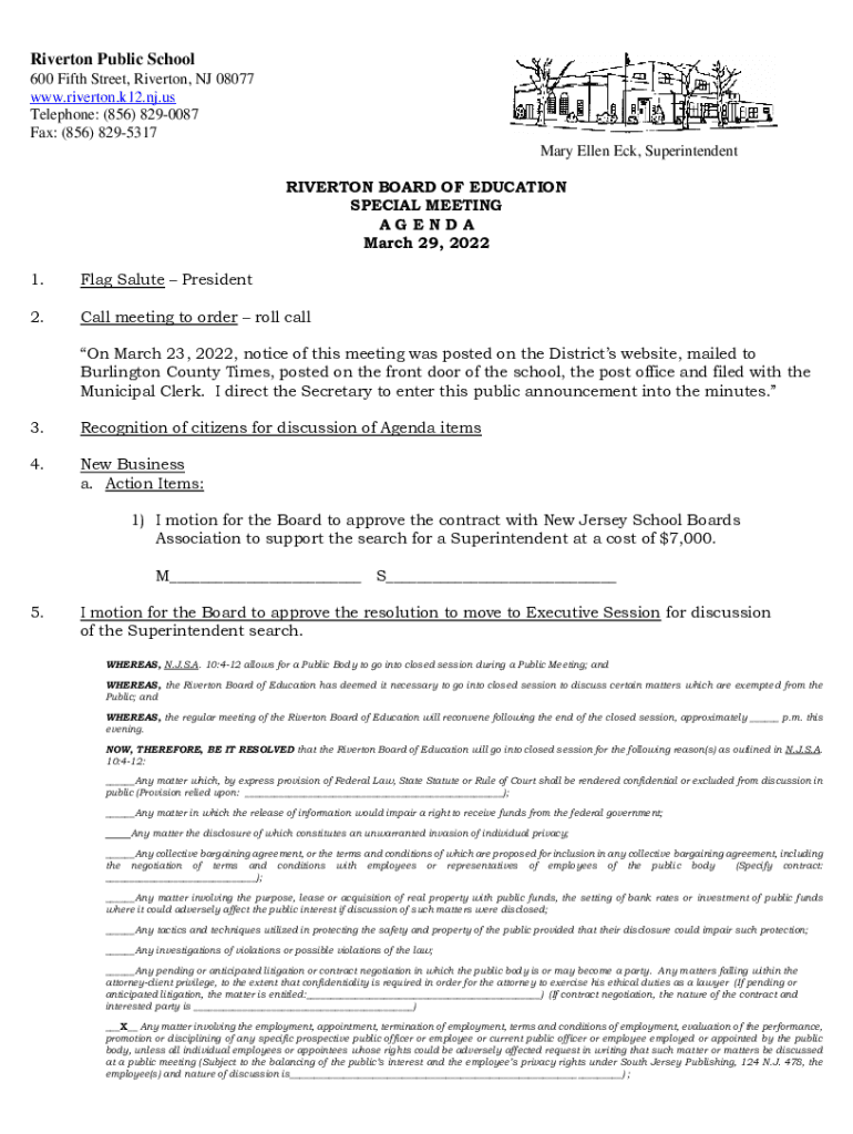 Riverton Public School 600 Fifth Street, Riverton, NJ 08077 www.riverton.k12.nj.us Telephone: (856) 8290087 Fax: (856) 8295317 Mary Ellen Eck, Superintendent RIVERTON BOARD OF EDUCATION SPECIAL MEETING