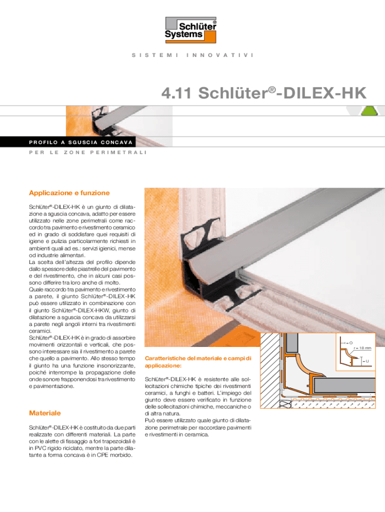 S I S T E M II N N O V A T I V I4.11 SchlterDILEXHK PROFILO A SGUSCIA CONCAVA P E RL EZ O N EPERIMETRALIApplicazione e funzione SchlterDILEXHK un giunto di dilatazione a sguscia concava, adatto per