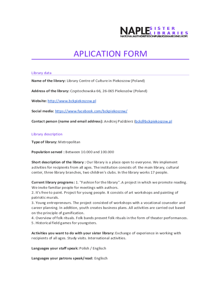 Address of the library: Czstochowska 66, 26065 Pinkos (Poland)