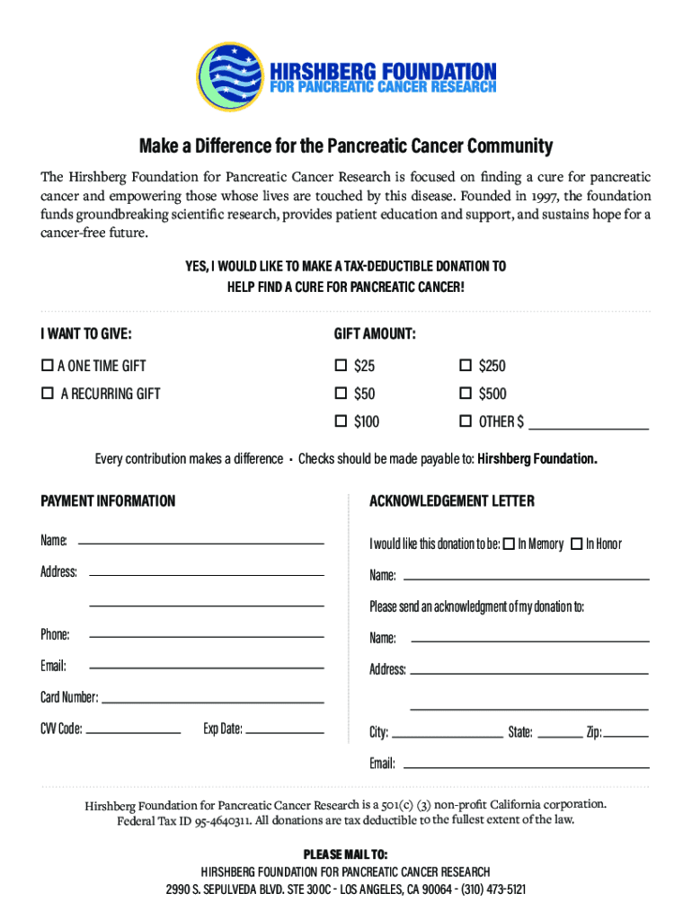Make a Difference for the Pancreatic Cancer Community The Hirshberg Foundation for Pancreatic Cancer Research is focused on finding a cure for pancreatic cancer and empowering those whose lives are