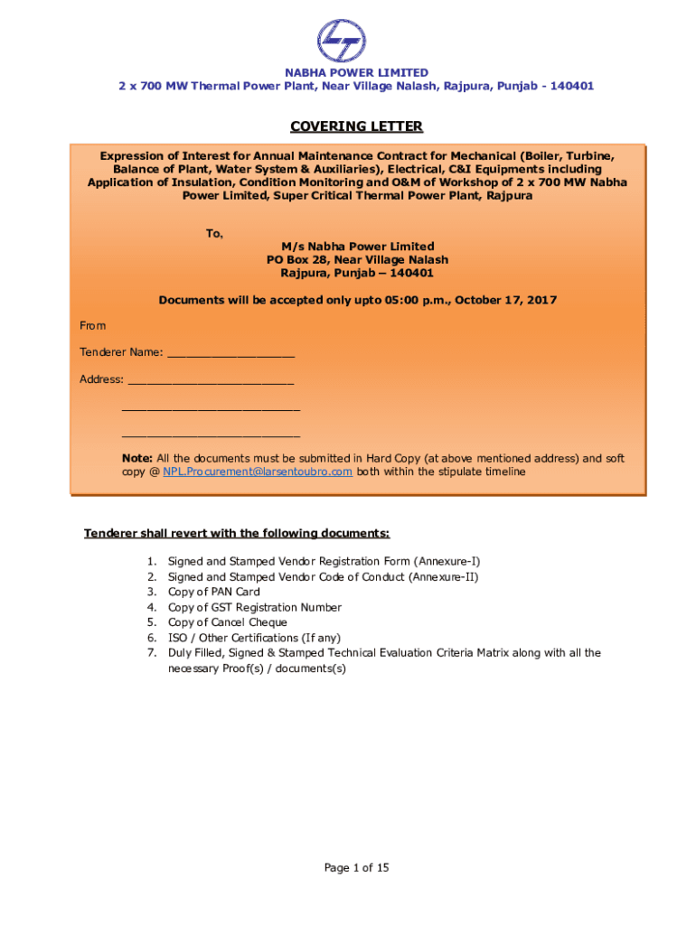 2 × 700 MW Thermal Power Plant, Near Village Na lash, Japura, Punjab 140401COVERING LETTER