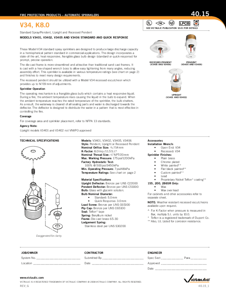 40.15FIRE PROTECTION PRODUCTS AUTOMATIC SPRINKLERSV34, K8.0VNIIPOSEE ITALIC PUBLICATION 10.01 FOR DETAILSStandard Spray/Pendent, Upright and Recessed Pendent