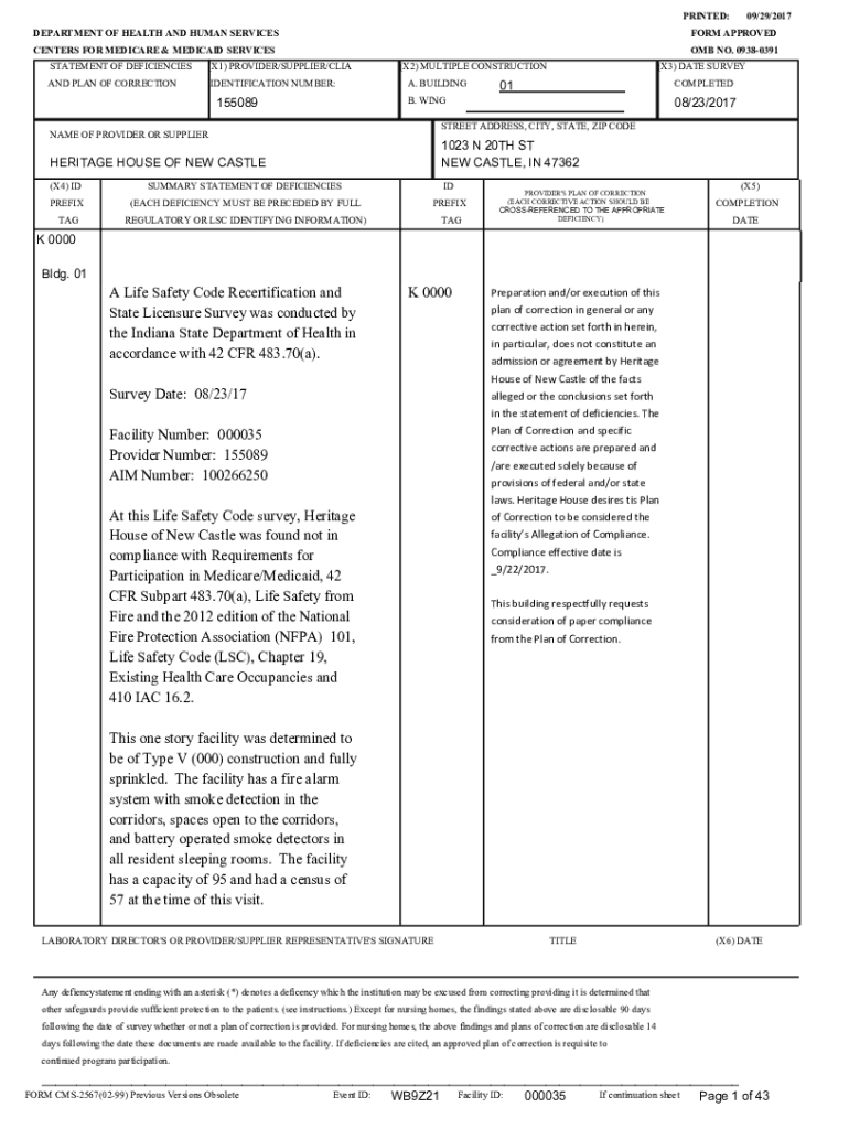 PRINTED: DEPARTMENT OF HEALTH AND HUMAN SERVICES CENTERS FOR MEDICARE & MEDICAID SERVICES STATEMENT OF DEFICIENCIES(X1) PROVIDER/SUPPLIER/CLIAAND PLAN OF CORRECTIONIDENTIFICATION NUMBER:15508909/29/2017FORM