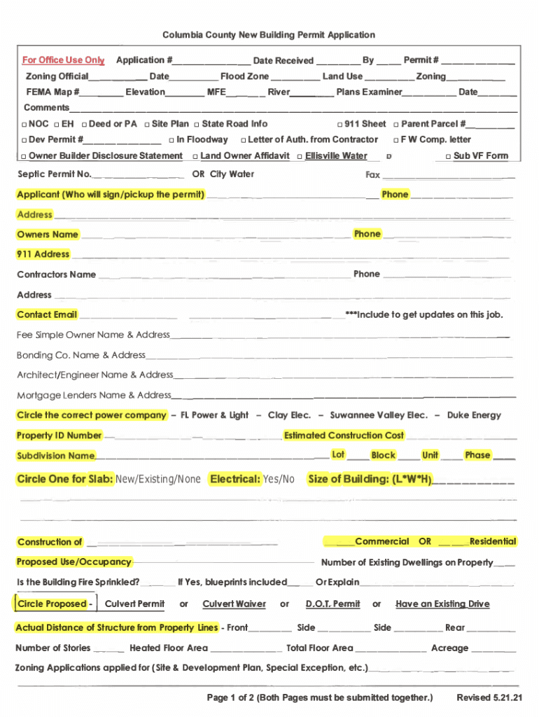 Revised 4/27/17 COLUMBIA COUNTY BUILDING DEPARTMENT135 NE Hernando Ave., Suite B21, Lake City, FL 32055 Office: 3867581008 Fax: 3867582160 www.columbiacountyfla.com/BuildingandZoning.asp NEW CONSTRUCTION