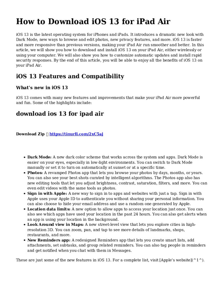How to Download iOS 13 for iPad Air iOS 13 is the latest operating system for iPhones and iPads. It introduces a dramatic new look with Dark Mode, new ways to browse and edit photos, new privacy features,