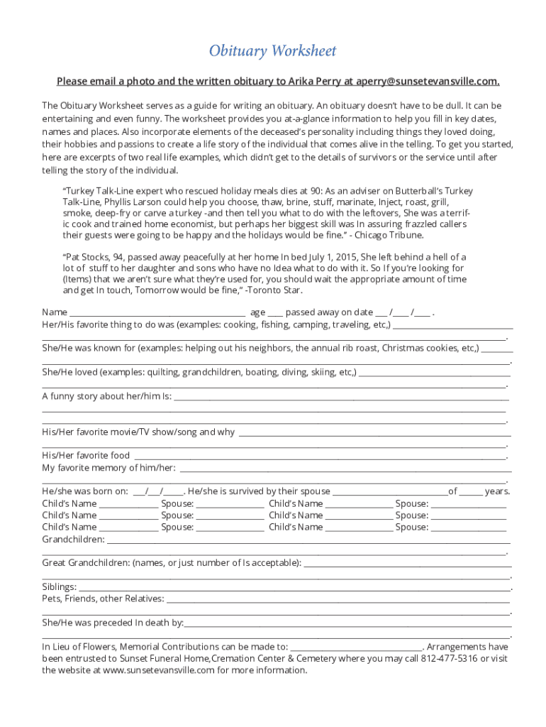 The Obituary Worksheet serves as a guide for writing an obituary. An obituary doesn't