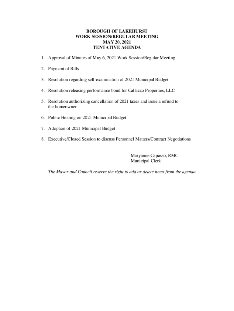 BOROUGH OF LAKEHURST WORK SESSION/REGULAR MEETING MAY 20, 2021 TENTATIVE AGENDA 1. Approval of Minutes of May 6, 2021 Work Session/Regular Meeting 2. Payment of Bills 3. Resolution regarding selfexamination