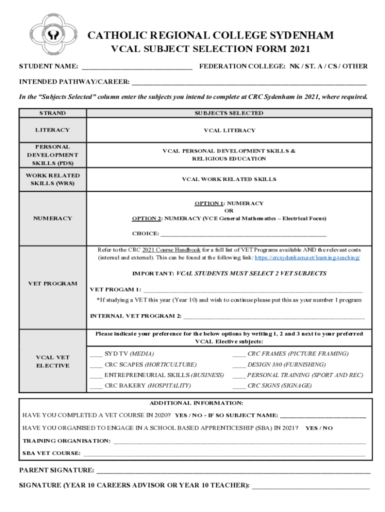 CATHOLIC REGIONAL COLLEGE SYDENHAM VCAL SUBJECT SELECTION FORM 2021 STUDENT NAME: ___ FEDERATION COLLEGE: NK / ST. A / CS / OTHER INTENDED PATHWAY/CAREER: ___ In the Subjects Selected column enter