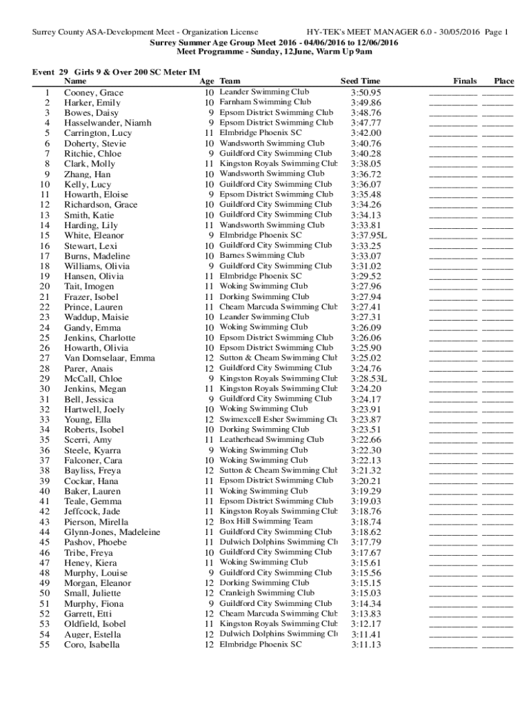 Surrey County ASADevelopment Meet Organization License HYTEK\'s MEET MANAGER 6.0 30/05/2016 Page 1 Surrey Summer Age Group Meet 2016 04/06/2016 to 12/06/2016 Meet Programme Sunday, 12June, Warm Up
