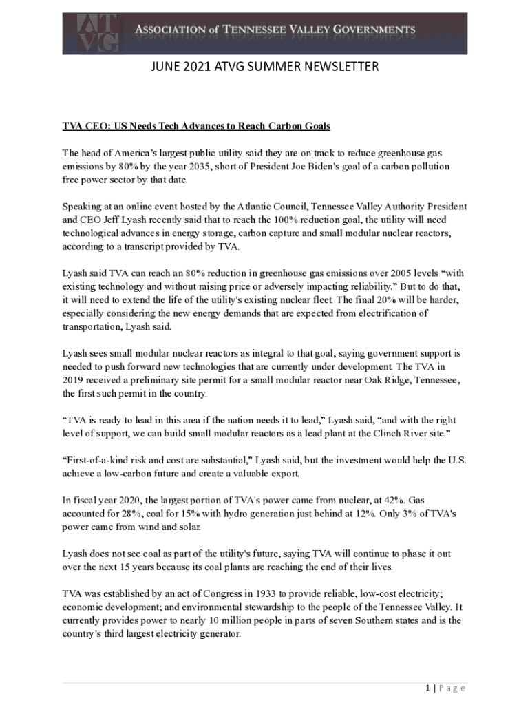 JUNE 2021 ATVG SUMMER NEWSLETTERTVA CEO: US Needs Tech Advances to Reach Carbon Goals The head of Americas largest public utility said they are on track to reduce greenhouse gas emissions by 80% by