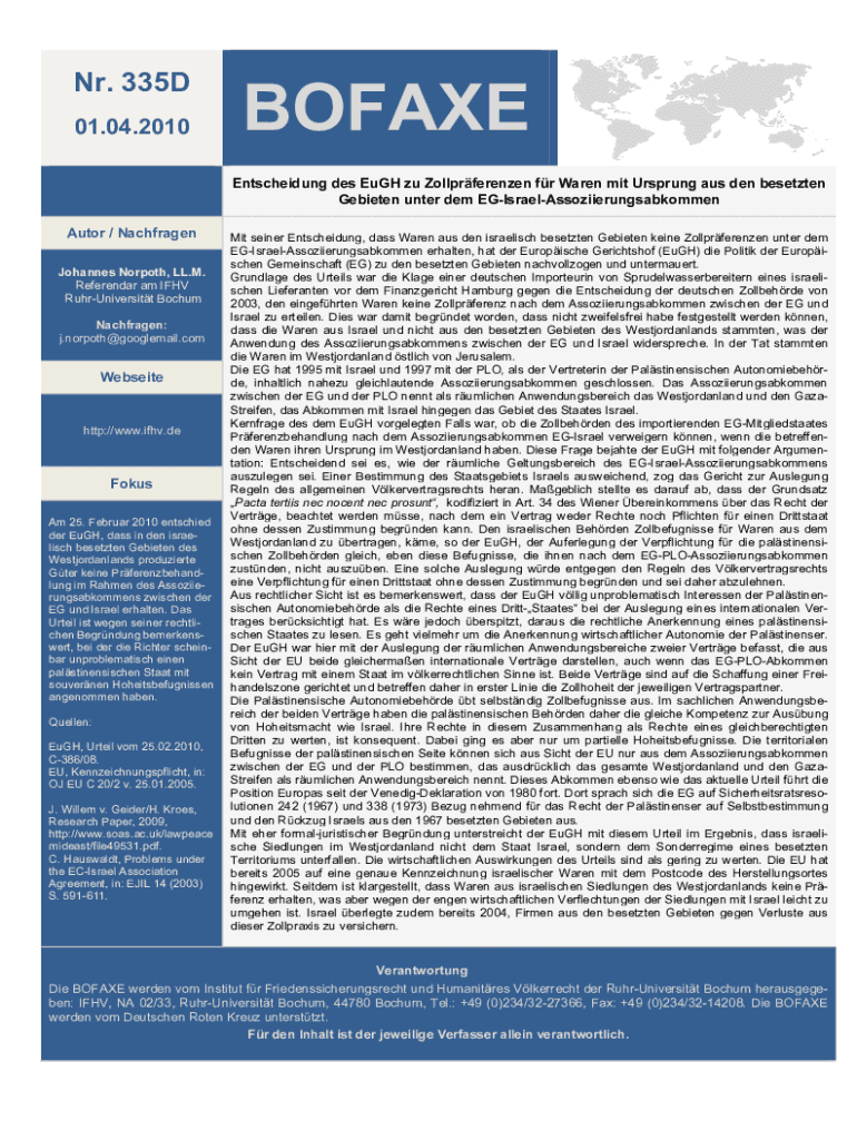 Nr. 335D 01.04.2010BOFAXE Entscheidung des EuGH zu Zollprferenzen fr Waren mit Ursprung aus den besetzten Gebieten unter dem EGIsraelAssoziierungsabkommenAutor / Nachfragen Johannes Norpoth, LL.M.