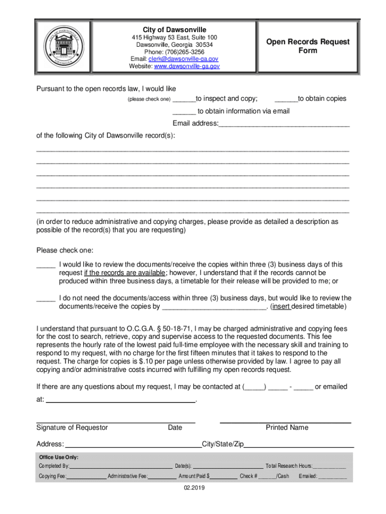 City of Dawsonville 415 Highway 53 East, Suite 100 Dawsonville, Georgia 30534 Phone: (706)2653256 Email: clerk@dawsonvillega.gov Website: www.dawsonvillega.govOpen Records Request FormPursuant to