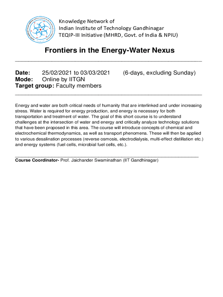 TEQIPIII Initiative (MHD, Govt. of India & NIU)Frontiers in the EnergyWater Nexus