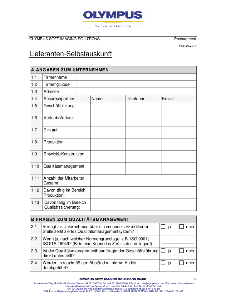 1.1Firmenname1.2Firmengruppe1.3Adresse1.4Ansprechpartner1.5Geschftsleitung1.6Vertrieb/Verkauf1.7Einkauf1.8Produktion1.9Entwickl./Konstruktion1.10Qualittsmanagement1.11Anzahl