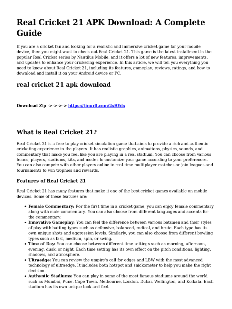 Real Cricket 21 APK Download: A Complete Guide If you are a cricket fan and looking for a realistic and immersive cricket game for your mobile device, then you might want to check out Real Cricket