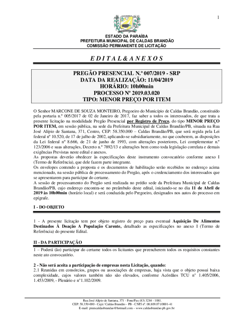 Obtenha o gratuito O Senhor MARCONE DE SOUZA MONTEIRO, Pregoeiro do Municpio de Caldas Brando, co...