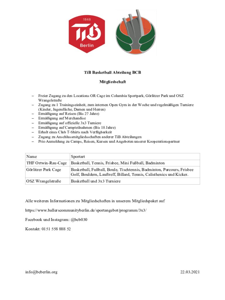 TiB Basketball Abteilung BCB Mitgliedschaft Freier Zugang zu den Locations OR Cage im Columbia Sportpark, Grlitzer Park und OSZ Wrangelstrae Zugang zu 1 Trainingseinheit, zum internen Open Gym in