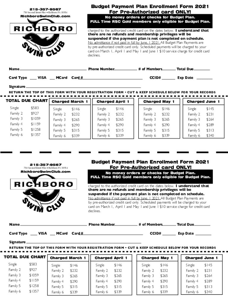 Budget Payment Plan Enrollment Form 2021 For PreAuthorized card ONLY!2153579567 750 Second Street Pike Richboro PA 18954RichboroSwimClub.comNo money orders or checks for Budget Plan. FULL Time RSC