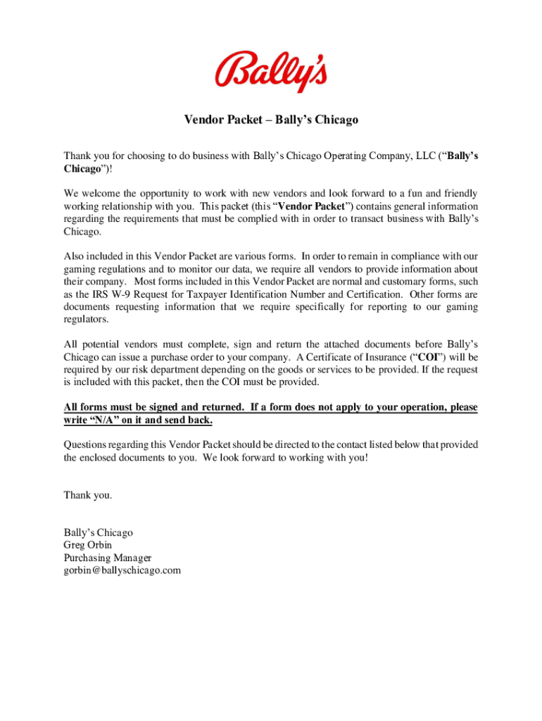 Vendor Packet Ballys Chicago Thank you for choosing to do business with Ballys Chicago Operating Company, LLC (Ballys Chicago)! We welcome the opportunity to work with new vendors and look forward