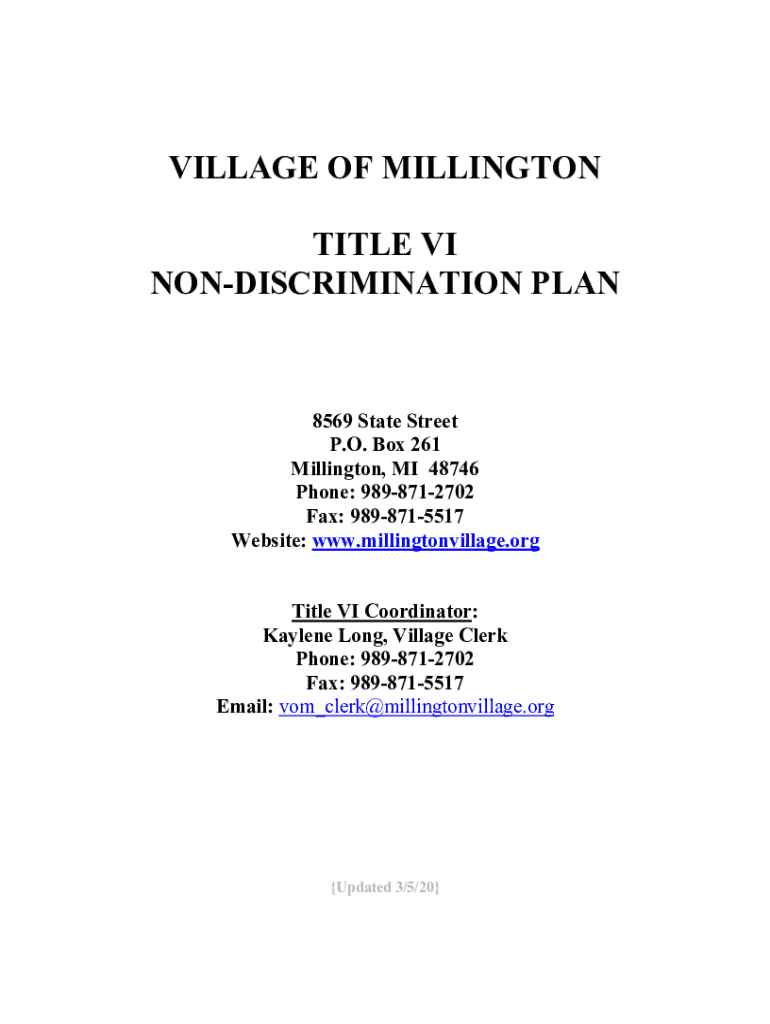 VILLAGE OF MILLINGTON TITLE VI NONDISCRIMINATION PLAN8569 State Street P.O. Box 261 Millington, MI 48746 Phone: 9898712702 Fax: 9898715517 Website: www.millingtonvillage.org Title VI Coordinator: