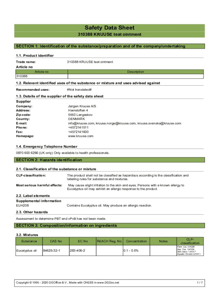 Safety Data Sheet 310388 KRUUSE teat ointment SECTION 1: Identification of the substance/preparation and of the company/undertaking 1.1. Product identifier 310388 KRUUSE teat ointmentTrade name:Article