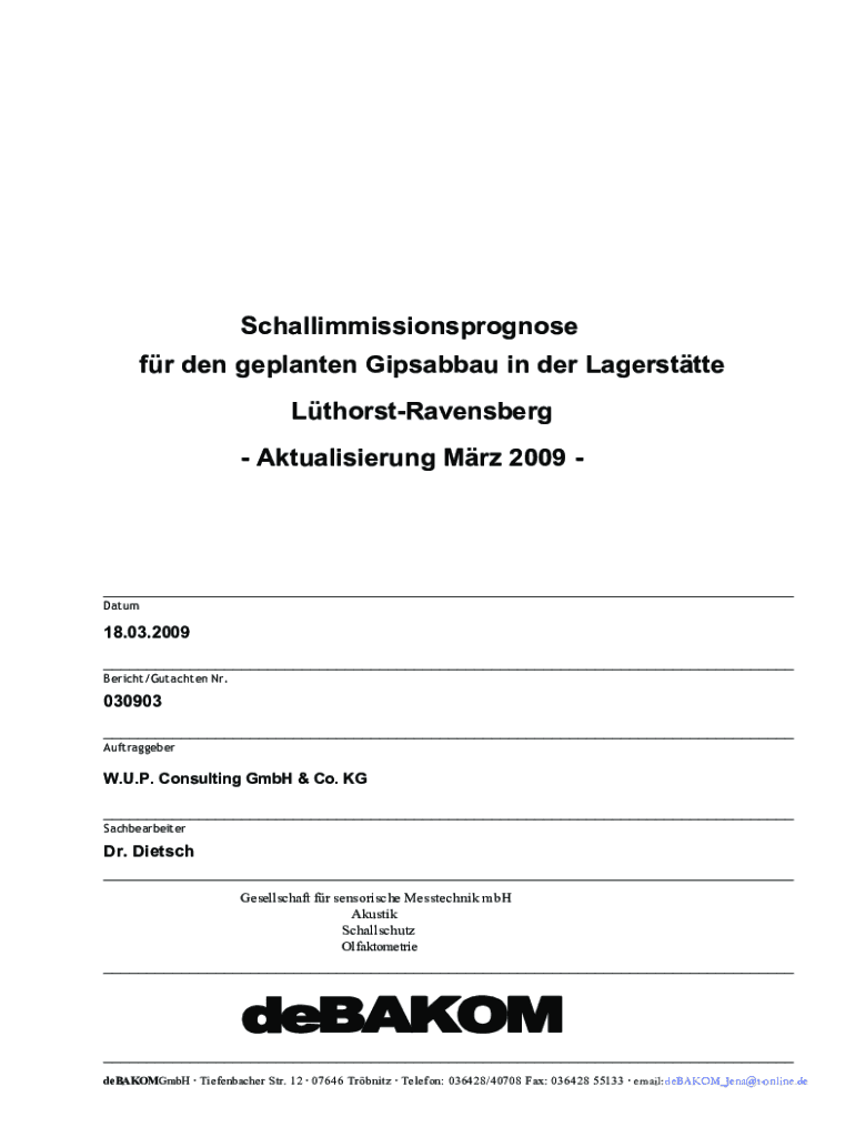 Schallimmissionsprognose fr den geplanten Gipsabbau in der Lagersttte LthorstRavensberg Aktualisierung Mrz 2009 ___ Datum18.03.2009 ___ Bericht/Gutachten Nr.030903 ___ AuftraggeberW.U.P. Consulting