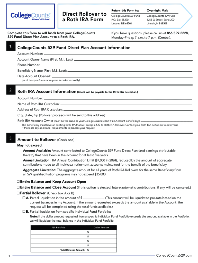Direct Rollover to a Roth IRA Form Complete this form to roll funds from your CollegeCounts 529 Fund Direct Plan Account to a Roth IRA.1.Return this Form to:Overnight Mail:CollegeCounts 529 Fund P.O.