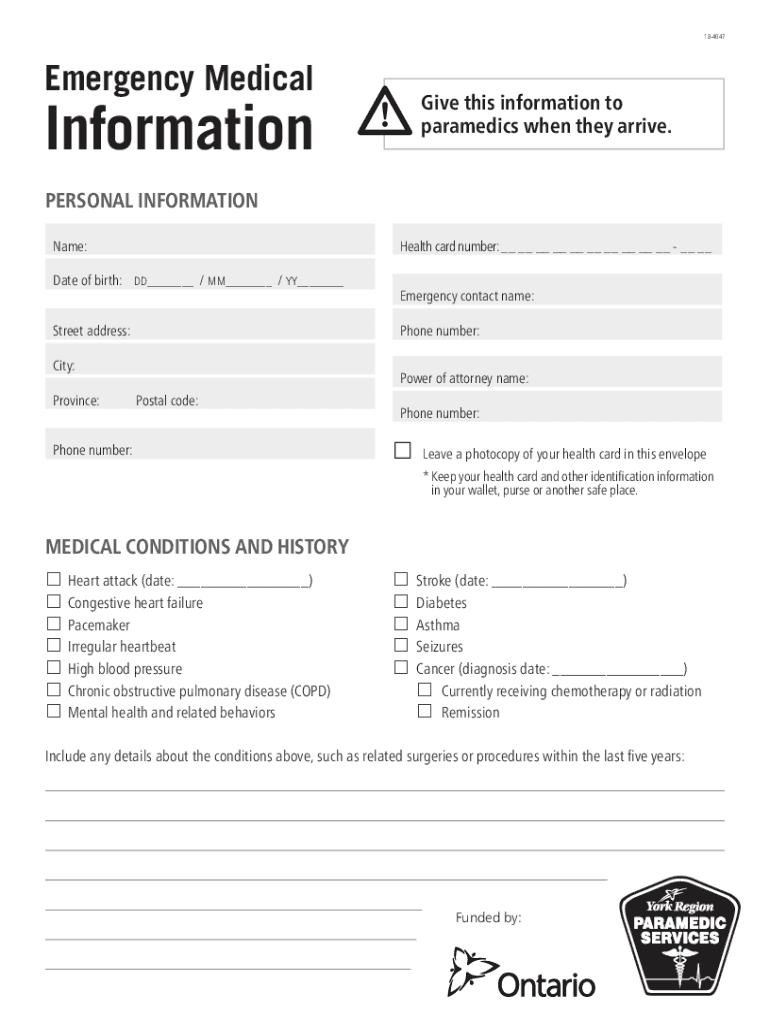 184047Emergency MedicalGive this information to paramedics when they arrive.Information PERSONAL INFORMATIONName:Health card number: __ __ __ __ __ __ __ __ __ __ __ __Date of birth: DD___ / MM___