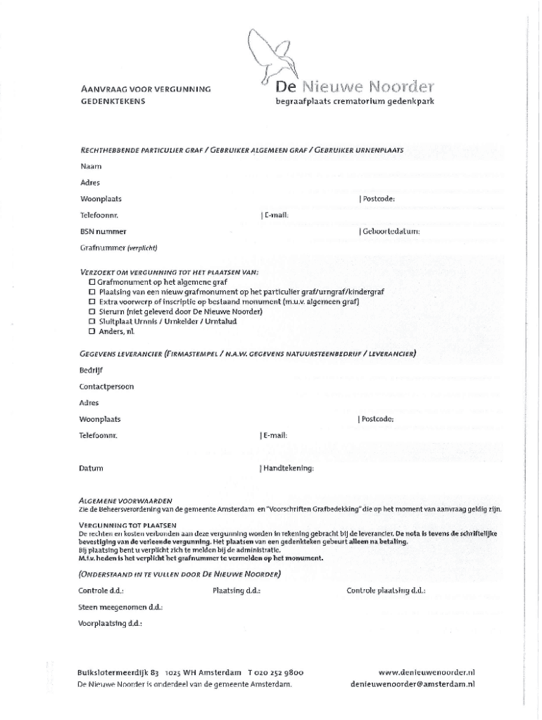 AANVRAAG VOOR VERGUNNINGDe Nie.u.v(iGEDENKTEKENSbegraafplaats crematorium gedenkparkRECHTHEBBENDE PARTICULIER GRAF / GEBRUIKER ALGEMEEN GRAF / GEBRUIKER URNENPLAATSNaam Adres I Postcode:Woonplaats1Email:Tel