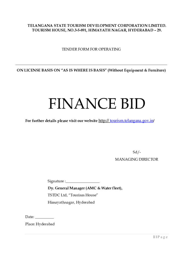 TOURISM HOUSE, NO.35891, HIAWATHA NAGAR, HYDERABAD 29.TENDER FORM FOR OPERATING___