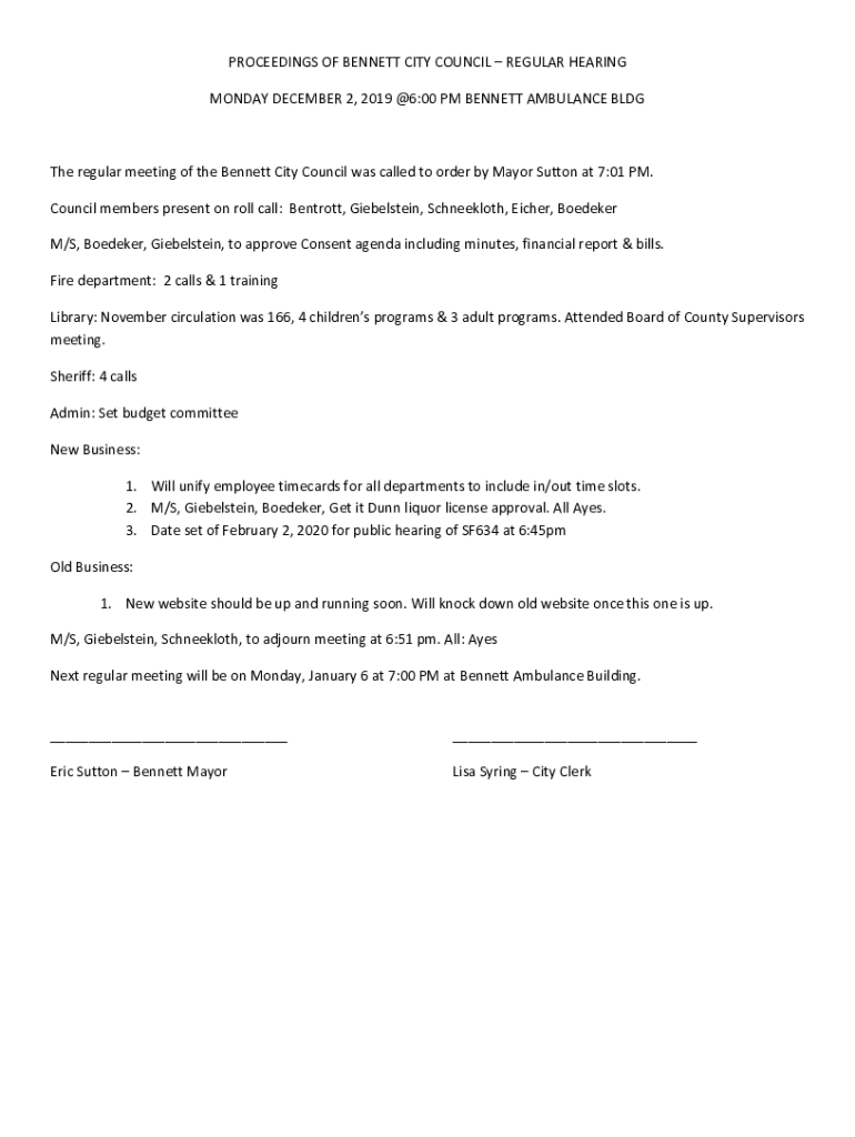 MONDAY, DECEMBER 2, 2019 @6:00 PM BENNETT AMBULANCE Blythe regular meeting of the Bennett City Council was called to order by Mayor Sutton at 7:01