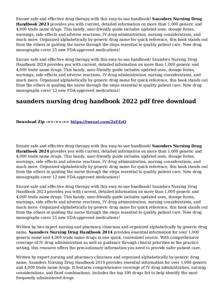 Ensure safe and effective drug therapy with this easytouse handbook! Saunders Nursing Drug Handbook 2023 provides you with current, detailed information on more than 1,000 generic and 4,000 trade