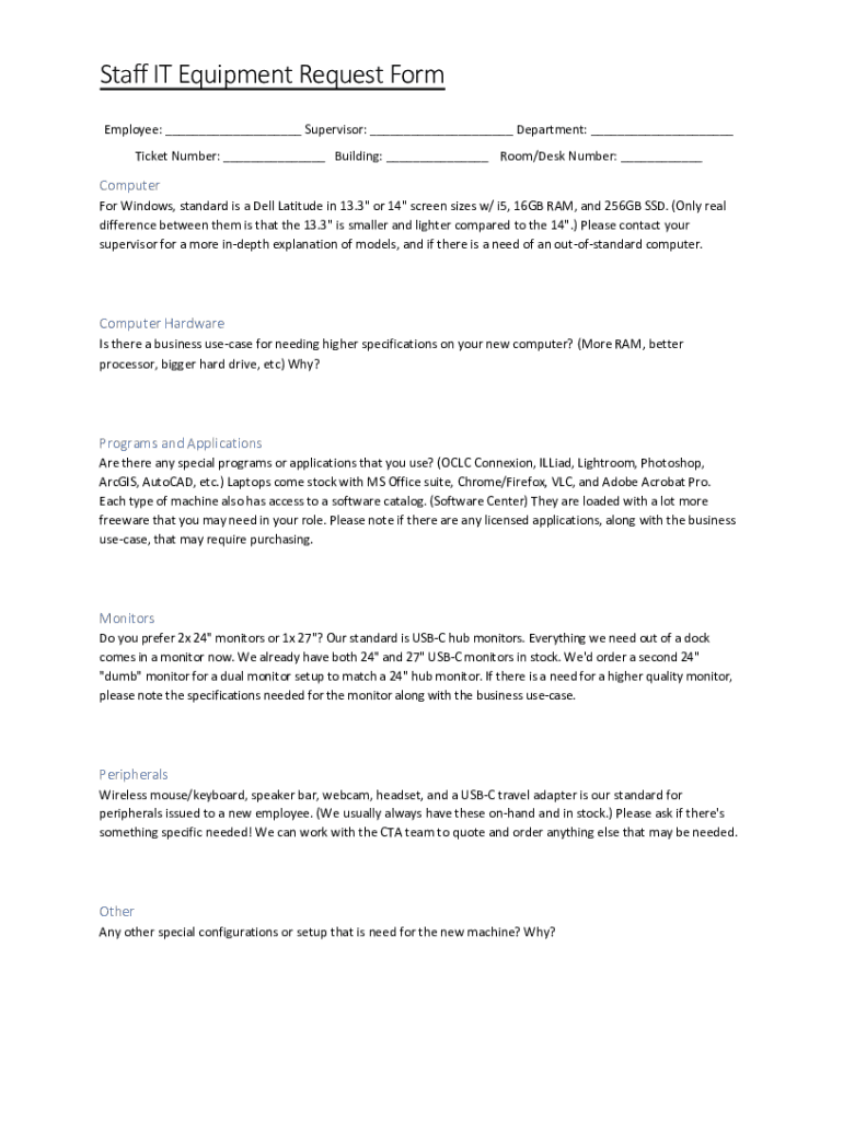 Staff IT Equipment Request Form Employee: ___ Supervisor: ___ Department: ___ Ticket Number: ___ Building: ___ Room/Desk Number: ___Computer For Windows, standard is a Dell Latitude in 13.3\" or 14\"