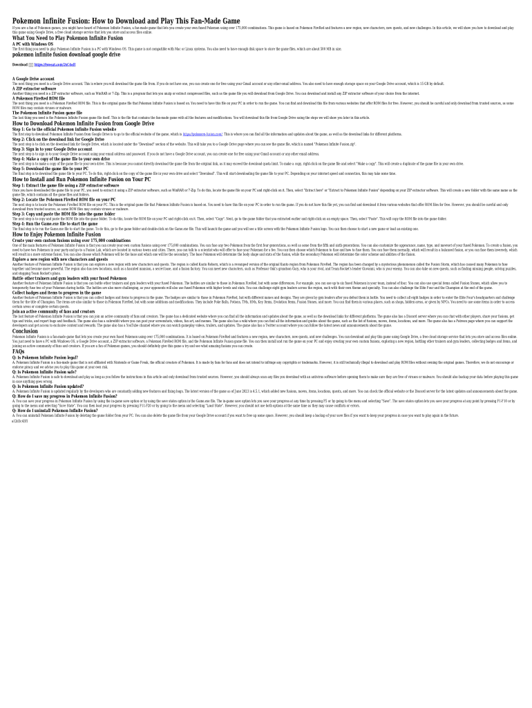 Pokemon Infinite Fusion: How to Download and Play This FanMade Game If you are a fan of Pokemon games, you might have heard of Pokemon Infinite Fusion, a fanmade game that lets you create your own