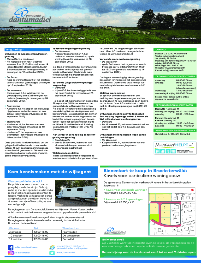 Voor alle inwoners van de gemeente DantumadielVergunningen Ontvangen aanvragen omgevingsvergunning n Damwld / De Westereen het kappen/rooien van 15 bomen waarvan 1 es (A. Prakkenstrjitte) en 14 iepen
