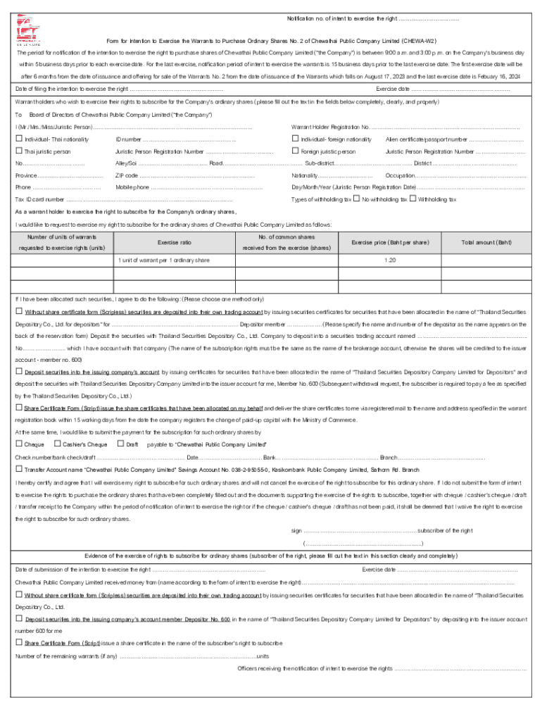 Notification no. of intent to exercise the right Form for Intention to Exercise the Warrants to Purchase Ordinary Shares No. 2 of Chewathai Public Company Limited (CHEWAW2) The period for notification