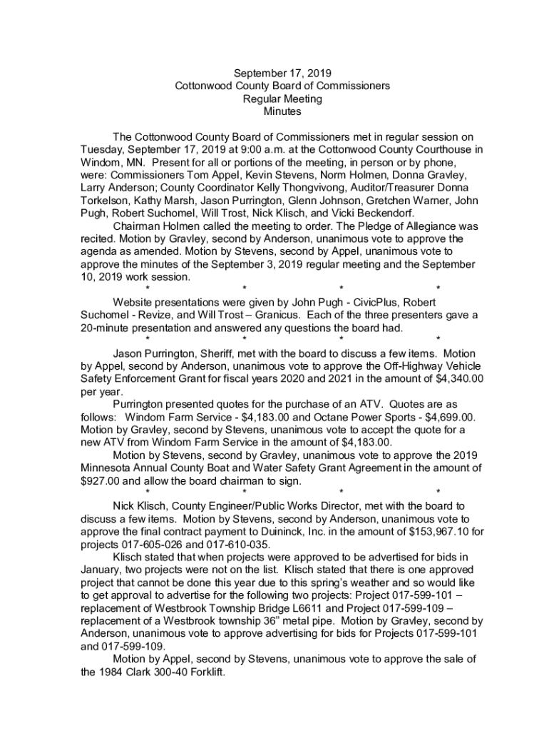 September 17, 2019 Cottonwood County Board of Commissioners Regular Meeting Minutes The Cottonwood County Board of Commissioners met in regular session on Tuesday, September 17, 2019 at 9:00 a.m.