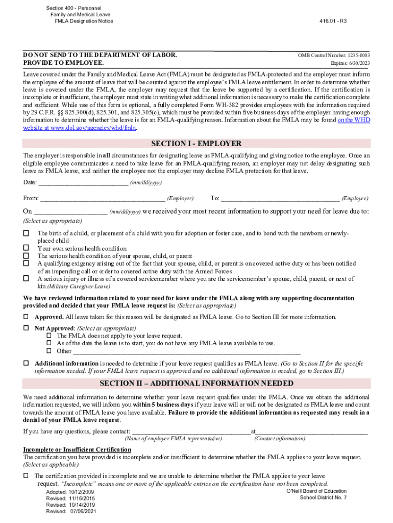 Section 400 Personnel Family and Medical Leave FMLA Designation Notice416.01 R3DO NOT SEND TO THE DEPARTMENT OF LABOR. PROVIDE TO EMPLOYEE.OMB Control Number: 12350003 Expires: 6/30/2023Leave covered