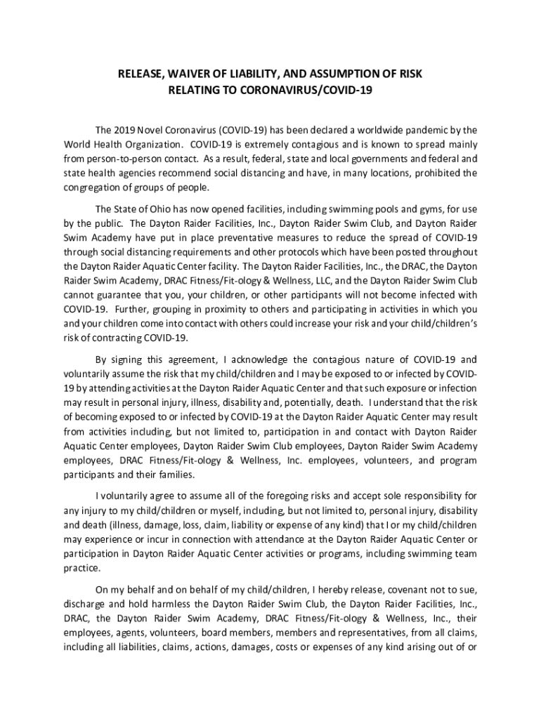 RELEASE, WAIVER OF LIABILITY, AND ASSUMPTION OF RISK RELATING TO CORONAVIRUS/COVID19 The 2019 Novel Coronavirus (COVID19) has been declared a worldwide pandemic by the World Health Organization. COVID19