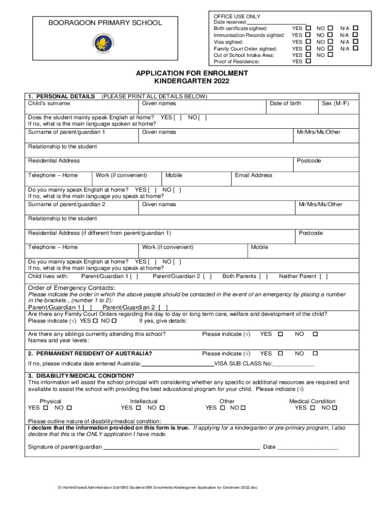BOORAGOON PRIMARY SCHOOLOFFICE USE ONLY Date received: Birth certificate sighted: Immunisation Records sighted: Visa sighted: Family Court Order sighted: Out of School Intake Area: Proof of Residence:[[YES