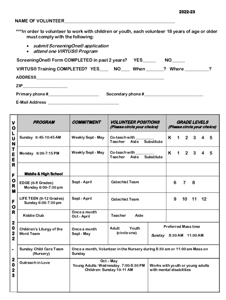 202223NAME OF VOLUNTEER___ ***In order to volunteer to work with children or youth, each volunteer 18 years of age or older must comply with the following: submit ScreeningOne application attend one