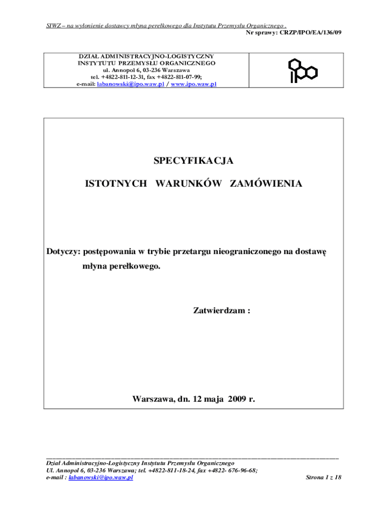 SIWZ na wyonienie dostawcy myna perekowego dla Instytutu Przemysu Organicznego . Nr sprawy: CRZP/IPO/EA/136/09DZIA ADMINISTRACYJNOLOGISTYCZNY INSTYTUTU PRZEMYSU ORGANICZNEGO ul. Annopol 6, 03236 Warszawa