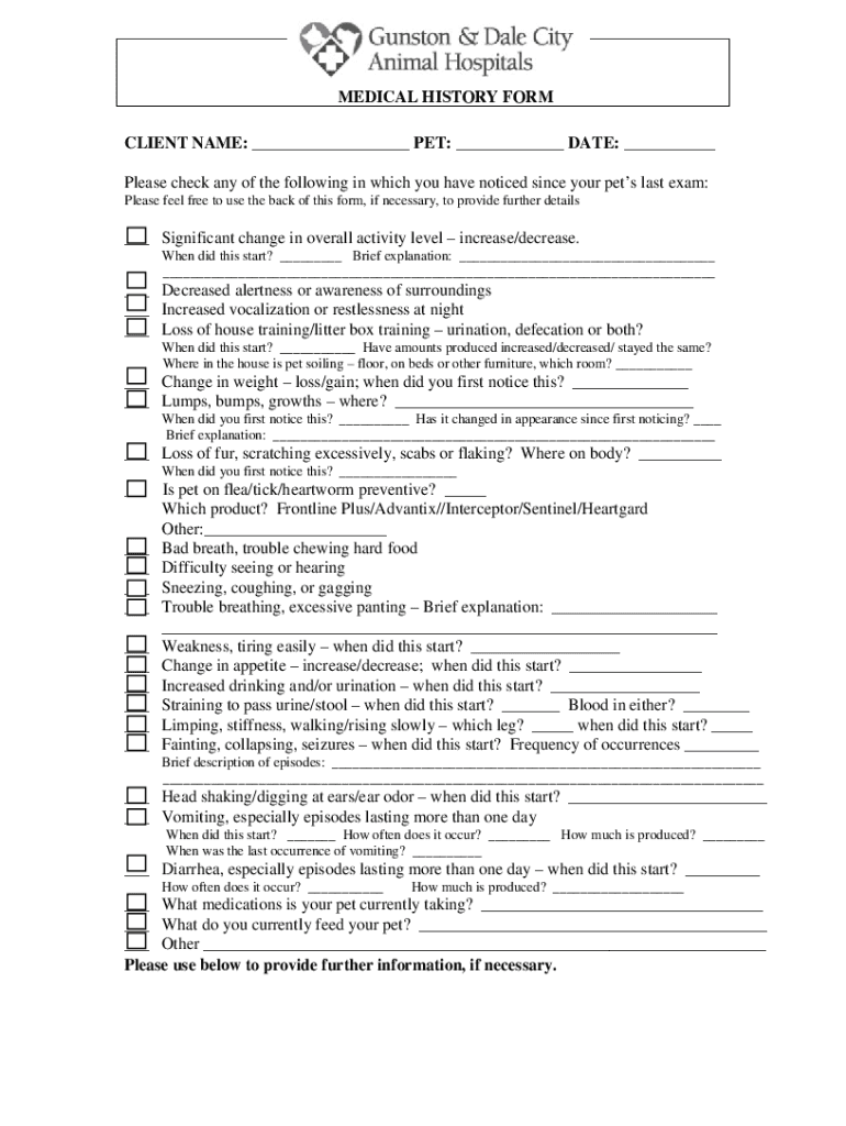 MEDICAL HISTORY FORM CLIENT NAME: ___ PET: ___ DATE: ___ Please check any of the following in which you have noticed since your pets last exam: Please feel free to use the back of this form, if necessary,