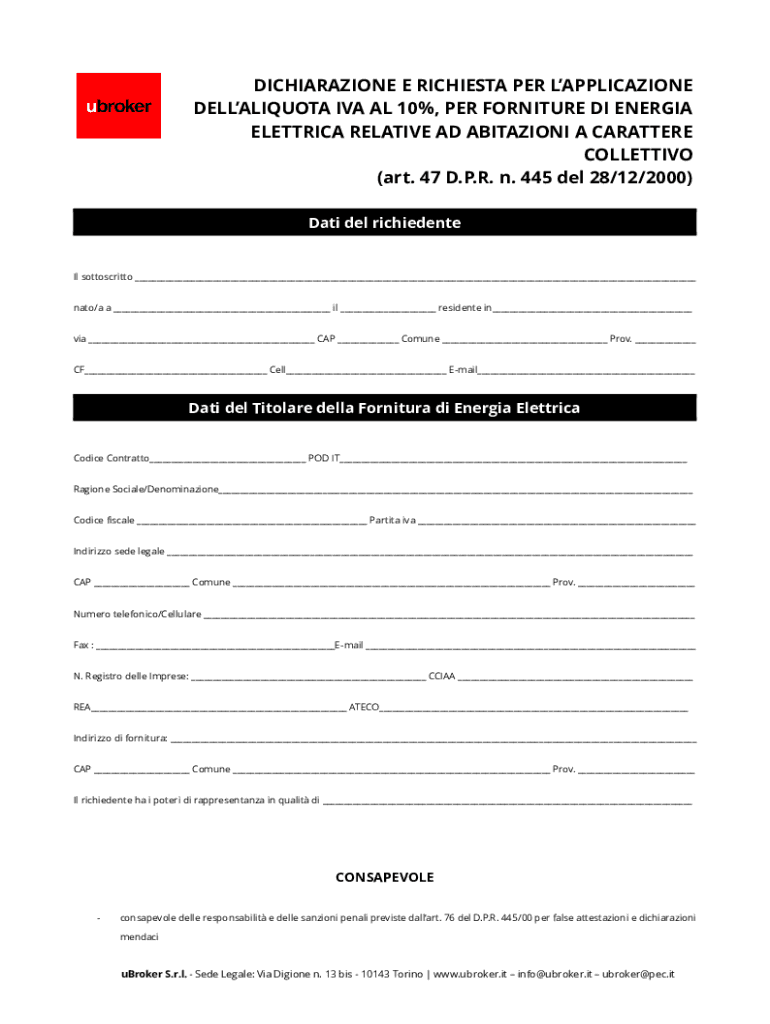 DICHIARAZIONE E RICHIESTA PER LAPPLICAZIONE DELLALIQUOTA IVA AL 10%, PER FORNITURE DI ENERGIA ELETTRICA RELATIVE AD ABITAZIONI A CARATTERE COLLETTIVO (art. 47 D.P.R. n. 445 del 28/12/2000) Dati del